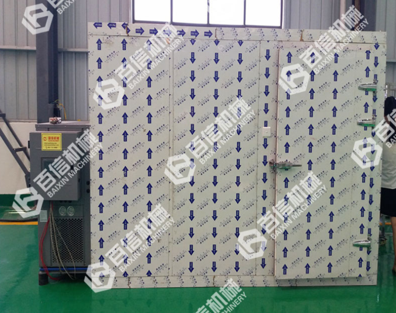 將所需要烘干的中藥材均勻平鋪在托盤上,然后將托盤放置到推車的層架上,送入烘干房內進行整齊擺放,熱源系統采用的是熱泵烘干,熱泵烘干主要是吸入空氣轉化成空氣能,提供穩定熱能,將熱能輸送到烘干房內,通過平行循環風機系統,將熱能轉化成熱風,在烘干房內進行循環,對藥材進行干燥處理,藥材排出的水分會以水蒸氣的形式排出烘干箱。
